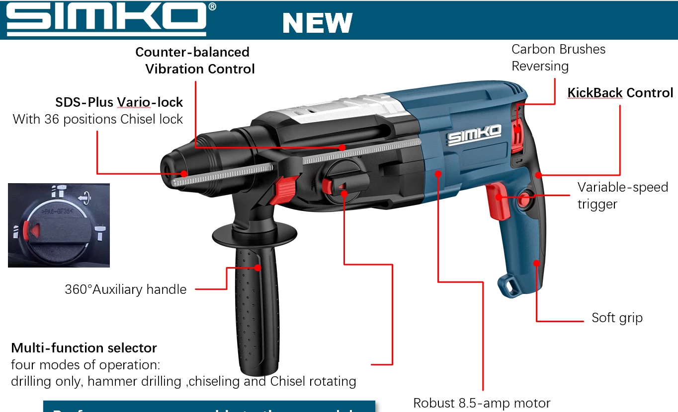 ● Control de vibración con contrapeso (SR290-28PA/B): mejora la comodidad del usuario durante las aplicaciones de taladrado o cincelado.