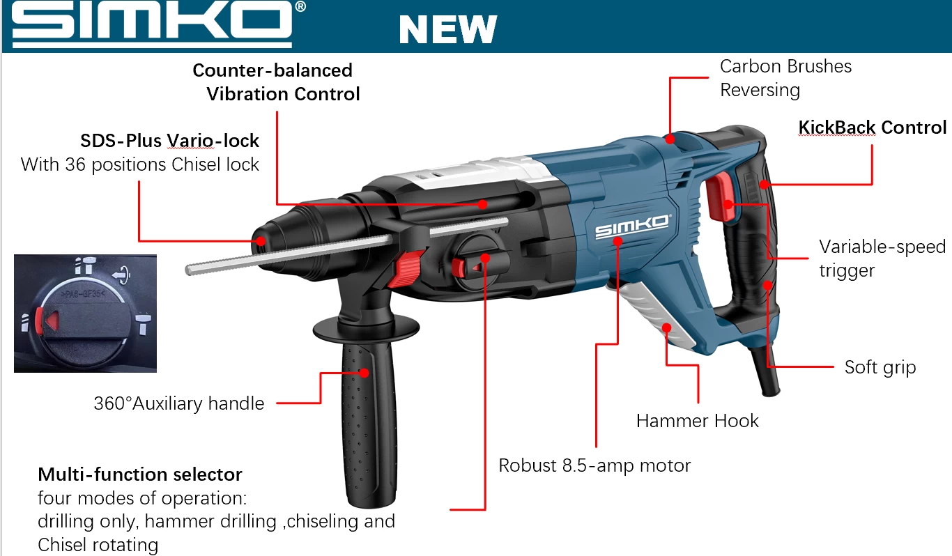 ● Control de vibración con contrapeso (SR290-28PA/B): mejora la comodidad del usuario durante las aplicaciones de taladrado o cincelado.