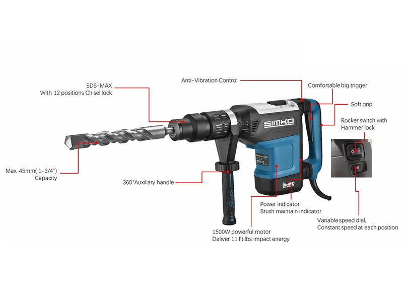 ● Rueda de ajuste de 6 pasos y control de velocidad constante para un ajuste variable de la velocidad y la frecuencia de impacto para un rendimiento óptimo .